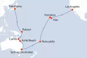 Itinerary : Yokohama, Rabaul, Cairns, Airlie Beach, Sydney (Australia), Nukualofa, date, Honolulu, Hilo, Los Angeles