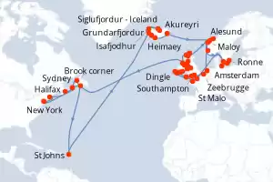 Itinerary : New York, Halifax, Sydney, St Pierre and Miquelon, St Johns, Grundarfjordur, Akureyri, Siglufjordur - Iceland, Isafjodhur, Reykjavik, Heimaey, Djupivogur, Alesund, Maloy, Haugesund, Amsterdam, Zeebrugge, Southampton, Portland, Falmouth, Dingle, Bantry, Cork, Waterford, Holyhead, Liverpool, Dun Laoghaire, Belfast, Douglas, Greencastle, Ullapool, Scrabster, Invergordon, Kristiansand, Copenhagen, Warnemunde, Ronne, Karlskrona, Southampton, Le Havre, St Malo, Falmouth, Cork, Holyhead, Glasgow, Killybegs, Brook corner, Sydney, Boston, New York