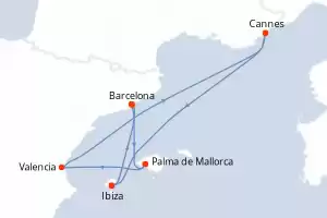 Itinerary : Barcelona, Palma de Mallorca, Valencia, Cannes, Ibiza, Barcelona