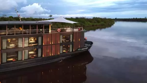 Designed by Studio Noor in Ho Chi Minh City, Aqua Nera draws inspiration from the Amazon's blackwater lagoons and subtly blends a soft ambiance with Peruvian, Spanish, and Portuguese craftsmanship. Measuring over 62 meters in length, this contemporary vessel features clean lines and an elegant silhouette, crafted to navigate the deep and less-traveled meanders of the Peruvian Amazon with ease. The interior design, both understated and sophisticated, pays homage to the region's cultural richness through nods to Shipibo-Conibo patterns, Iquitos tiles, and noble materials.