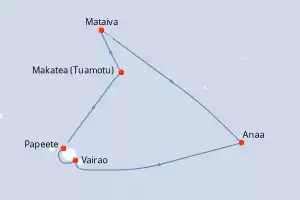 Itinerary : Papeete, Makatea (Tuamotu), Mataiva, Anaa, Vairao, Papeete