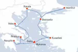 Itinerary : Piraieus, Nauplio, Mykonos, Delos, Kusadasi, Bozcaada, Istanbul, Kavala, Volos, Piraieus