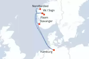 Itinerary : Hamburg, Stavanger, Flaam, Nordfjordeid, Vik I Sogn, Hamburg
