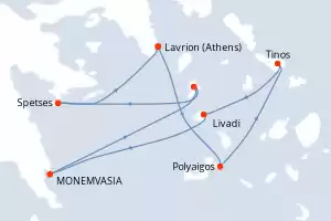 Itinerary : Lavrion (Athens), Polyaigos, Tinos, Livadi, MONEMVASIA, Merichas – Kythnos, Spetses, Lavrion (Athens)