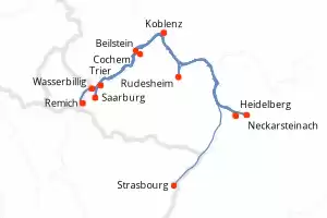 Itinerary : Remich, Wasserbillig, Saarburg, Remich, Wasserbillig, Saarburg, Trier, Beilstein, Cochem, Koblenz, Rudesheim, Koblenz, Rudesheim, Neckarsteinach, Heidelberg, Strasbourg
