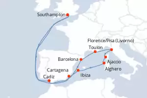 Itinerary : Southampton, Cadiz, Barcelona, Toulon, Florence/Pisa (Livorno), Ajaccio, Alghero, Ibiza, Cartagena, Southampton