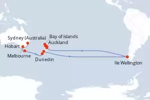 Itinerary : Sydney (Australia), Melbourne, Hobart, Fiordland, DUnedin, Christchurch, Wellington, Napier, Bay of islands, Tauranga, Auckland