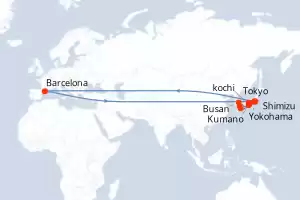 Itinerary : Barcelona, Tokyo, Yokohama, Tokyo, Kumano, Shimotsu, Kochi, Busan, Nagasaki, Kagoshima, Shimizu, Kyoto, Yokohama, Tokyo, Barcelona, Tokyo