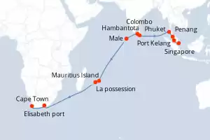 Itinerary : Singapore, Port Kelang, Penang, Phuket, Hambantota, Colombo, Male, Mauritius Island, La possession, Elisabeth port, Cape Town