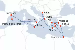 Itinerary : Barcelona, Valetta, Chania, Santorini, Kusadasi, Piraieus, Alexandria, Rhodes, Mykonos, Piraieus, Kotor, Corfu, Messina, Palma de Mallorca, Barcelona