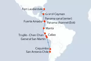 Itinerary : San Antonio Chile, Coquimbo, General San Martin, Callao, Trujillo - Chan Chan, Manta, Fuerte Amador, Panama canal (enter), Panama channel (Exit), Grand Cayman, Fort Lauderdale