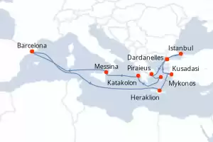Itinerary : Barcelona, Heraklion, Kusadasi, Dardanelles, Istanbul, Dardanelles, Piraieus, Mykonos, Katakolon, Messina, Barcelona
