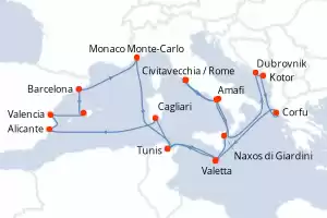 Itinerary : Civitavecchia / Rome, Amafi, Dubrovnik, Kotor, Corfu, Valetta, Tunis, Cagliari, Alicante, Valencia, Palma de Mallorca, Barcelona, Monaco Monte-Carlo, Tunis, Valetta, Naxos di Giardini, Salerno, Civitavecchia / Rome