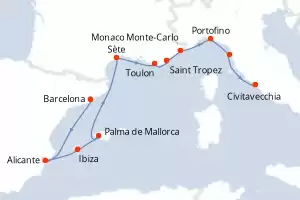 Itinerary : Barcelona, Alicante, Ibiza, Palma de Mallorca, Sete, Toulon, Saint Tropez, Monaco Monte-Carlo, Portofino, Florence/Pisa (Livorno), Civitavecchia / Rome