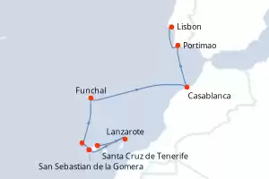 Itinerary : Santa Cruz de Tenerife, Lanzarote, San Sebastian de la Gomera, Santa Cruz de la Palma, Funchal, Casablanca, Portimao, Lisbon