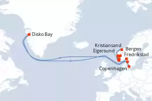 Itinerary : Copenhagen, Disko Bay, Fredrikstad, Oslo, Arendal, Eigersund, Skua Glacier, Lysefjord, Nordfjordeid, Geiranger, Hellesylt, Alesund, Bergen