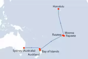 Itinerary : Sydney (Australia), Bay of Islands, Auckland, date, Raiatea, Papeete, Moorea, Honolulu