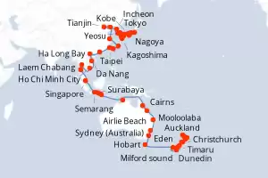 Itinerary : Tokyo, Nagoya, Kobe, Kochi, Hiroshima, Beppu, Kagoshima, Nagasaki, Hakata, Busan, Yeosu, Incheon, Tianjin, Dalian, Shanghai, Okinawa, Ishigaki, Taipei, Hong Kong, Ha Long Bay, Da nang, Ho Chi Minh City, Laem Chabang, Ko Samui, Singapore, Semarang, Surabaya, Celukan Bawang, Benoa, Darwin, Cairns, Airlie Beach, Moolooba, Sydney (Australia), Eden, Hobart, Milford Sound, DUnedin, Timaru, Christchurch, Picton, Wellington, Napier, Gisborne, Tauranga, Auckland