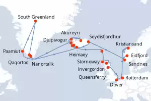 Itinerary : Rotterdam, Kristiansand, Eidfjord, Sandnes, Seydisfjordhur, Djupivogur, Akureyri, Isafjodhur, Grundarfjordur, Paamiut, South Greenland, Qaqortoq, Nanortalik, Heimaey, Reykjavik, Runavik, Stornoway, Invergordon, Queensferry, Dover, Rotterdam