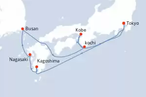 Itinerary : Tokyo, Kagoshima, Nagasaki, Busan, Kochi, Kobe, Tokyo, Kagoshima, Nagasaki, Busan, Kochi, Kobe, Tokyo