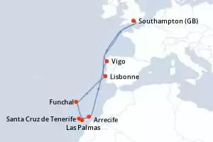 Itinerary : Southampton, Lisbon, Funchal, Las Palmas, Santa Cruz de Tenerife, Arrecife, Vigo, Southampton