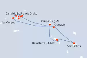 Itinerary : St Johns, Gustavia, St. Francis Drake Channel, Norman Island, Sopers Hole, Jost Van Dyke, Spanish Town, Virgin Islands, Philippsburg, Basseterre (St Kitts), South Friar's - beach, St Johns