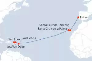 Itinerary : San Juan, Jost Van Dyke, St Johns, Santa Cruz de la Palma, Santa Cruz de Tenerife, Lisbon, San Juan, Jost Van Dyke, St Johns, Santa Cruz de la Palma, Santa Cruz de Tenerife, Lisbon