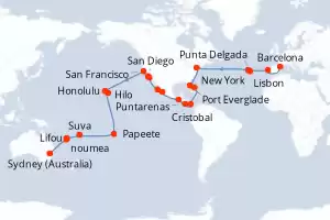 Itinerary : Barcelona, Lisbon, Punta Delgada, Praia da Vitoria, New York, Port Everglade, Half Moon Cay, Cristobal, Puntarenas, Puerto Quetzal, Puerto Vallarta, Cabo San Lucas, San Diego, Los Angeles, San Francisco, Honolulu, Hilo, Papeete, Suva, Lifou, noumea, Sydney (Australia)