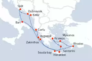 Itinerary : Bari, Corfu, Argostoli, Souda bay, Rhodes, Mykonos, Piraieus, Santorini, Heraklion, Zakinthos, Kotor, Dubrovnik, Split, Bari