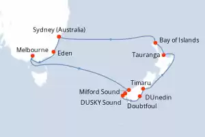 Itinerary : Sydney (Australia), Eden, Melbourne, DUSKY Sound, Doubtfoul, Milford Sound, DUnedin, Timaru, Tauranga, Bay of Islands, Sydney (Australia), Hobart, Sydney (Australia)