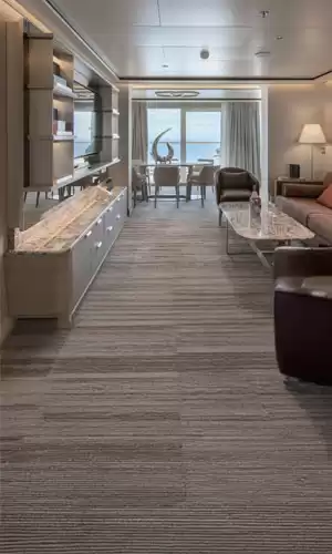 There are 9 categories of suites, the largest of which can be twinned with another for added volume. The Classic Veranda, Panorama, Vista, Superior Veranda and Deluxe Veranda suites range in size from 31 to 36 square meters. The Silver Suite is 73 meters², 88 to 98 meters² for the Owner's, 105 for the Royal and 137 to 146 for the Grande Suite.