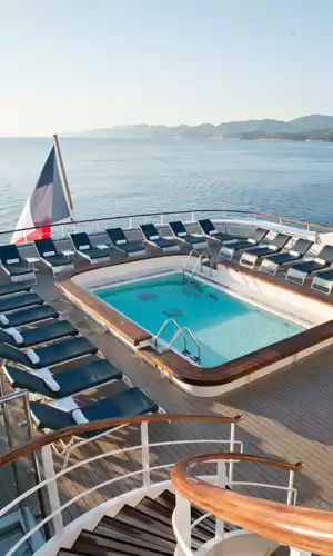 Le Ponant is a three-masted yacht from the French company Ponant, accommodating 32 passengers in 16 spacious suites. Renovated in 2022, this luxury sailing yacht of French tradition offers an exceptional ratio of one crew member for each cruiser. Le Ponant features a sun deck, a marina with 2 clear-bottom kayaks and a natural swimming pool, as well as a wellness and fitness area. It also boasts a refined lounge and a panoramic restaurant serving exceptional gourmet cuisine blending local and international flavors, using fresh ingredients purchased directly in the ports of call.