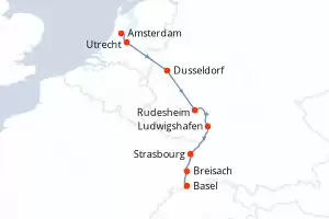Itinerary : Amsterdam, Utrecht, Dusseldorf, Rhine Gorge, Rudesheim, Ludwigshafen, Strasbourg, Breisach, Basel