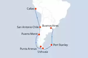 Itinerary : Buenos Aires, Port Stanley, Ushuaia, Punta Arenas, Puerto Montt, San Antonio Chile, Callao